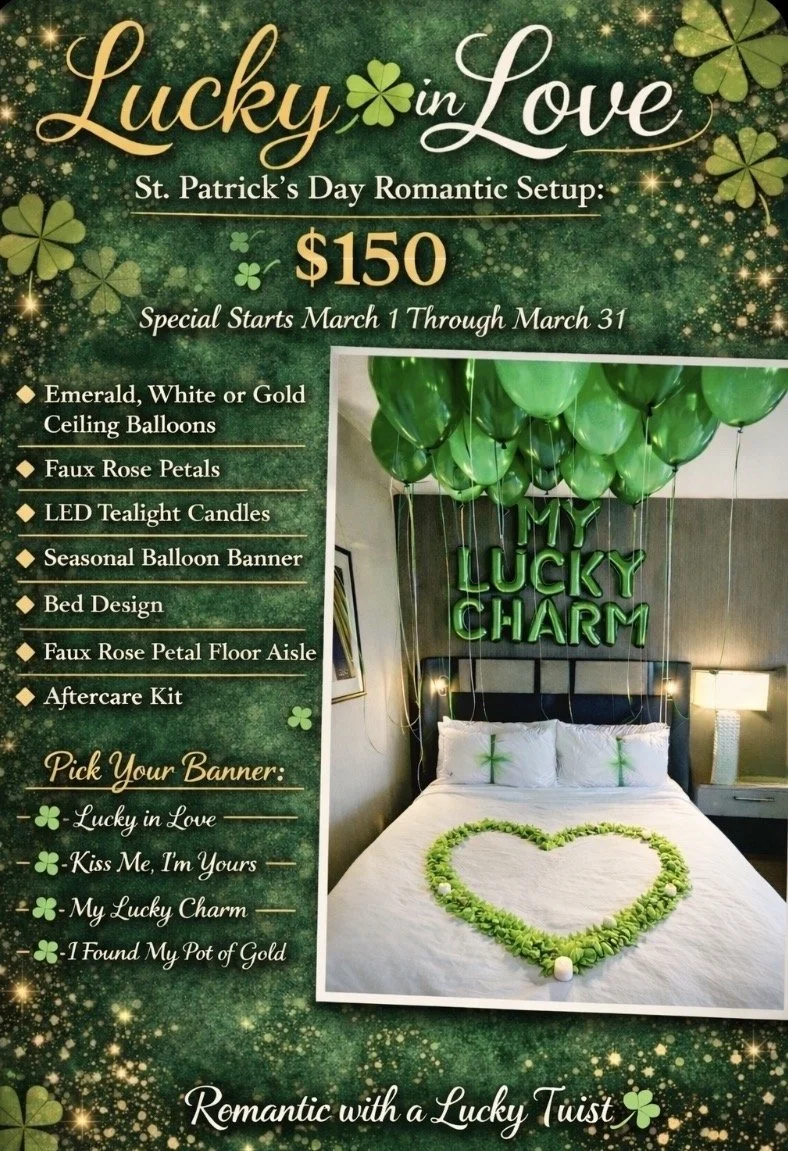 The Lucky in Love setup is a seasonal romantic experience designed to feel elevated, heartfelt, and fun. Thoughtfully styled with emerald and gold accents, candlelight, faux rose petals, and a custom balloon banner, this March-only setup is perfect for couples looking to celebrate something special.